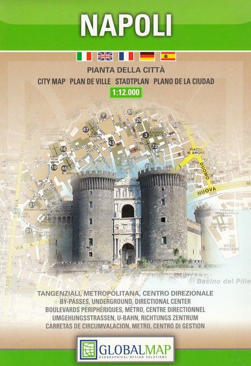 Plan miasta Neapol w skali 1:12 000 zawiera: plan centrum miasta s kali 1:8 000, indeks ulic, kościoły, cmentarze, muzea, pałace, szpitale, sieć linii metra, boiska sportowe, parki, ogrody botaniczne.