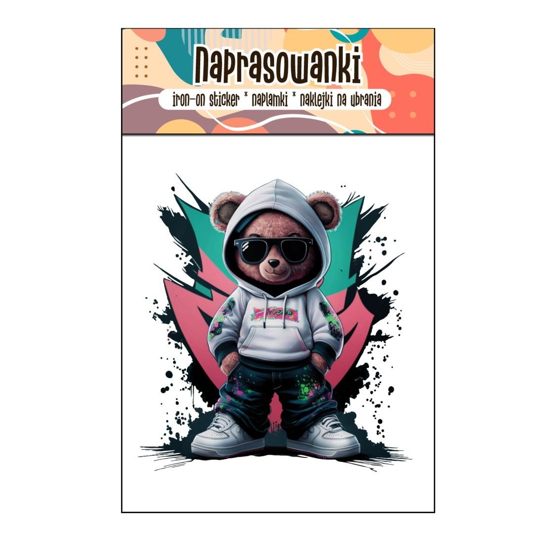 Naprasowanka prezentująca zabawną postać Misia w stylu Hip-Hop w kapturze..