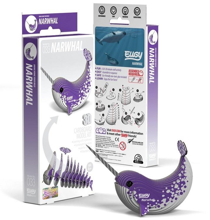 Eugy zaprojektowane w Nowej Zelandii są wykonane z przyjaznego dla środowiska kartonu pochodzącego z recyklingu i farby na bazie ryżu. Zestaw zawiera ponumerowane elementy układanki, nietoksyczny klej oraz instrukcję do zbudowania narwala. Zbierz całą serię zwierząt, ptaków, dinozaurów i wiele innych. Dla dzieci w wieku 6 lat+.
