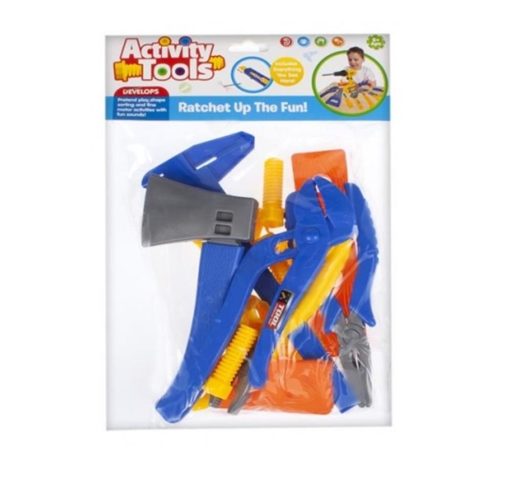 Wieloelementowy zestaw plastikowych narzędzi dla małego majsterkowicza.