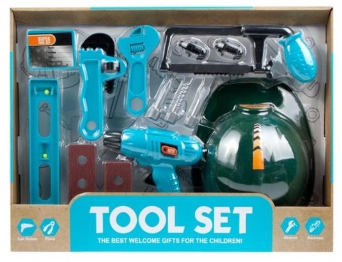 Zestaw narzędzi z kaskiem, wiertarką i piłą ręczną do zabawy w majsterkowanie.