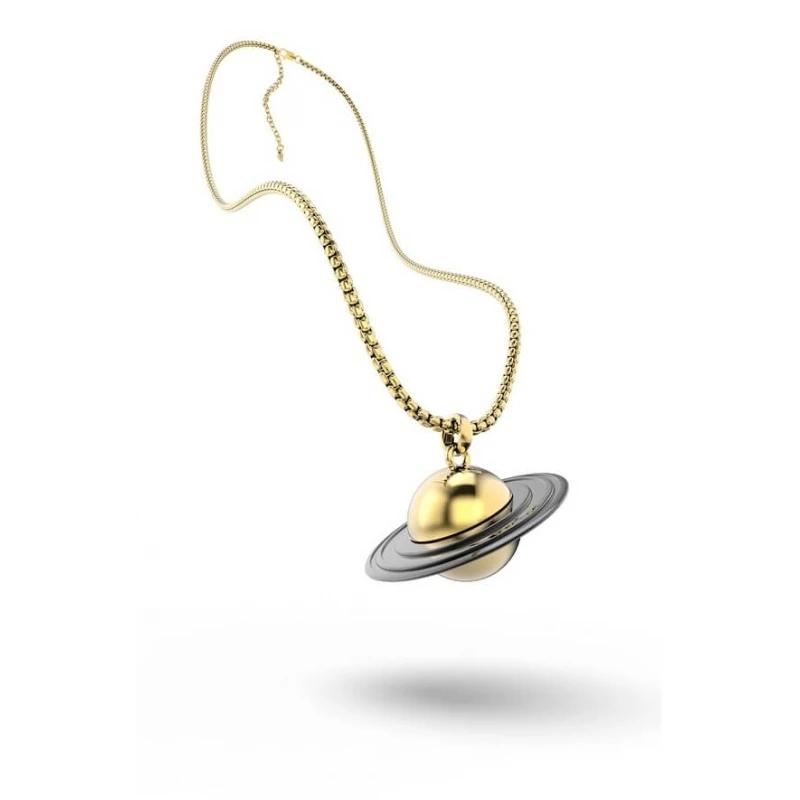 Kosmiczny naszyjnik planeta Saturn to świetna propozycja dla miłośników kosmosu, planet i układu słonecznego. Planeta Saturn w kolorze złotym z czarnym pierścieniem zawieszona na łańcuszku w kolorze planety, z możliwością regulacji długości.