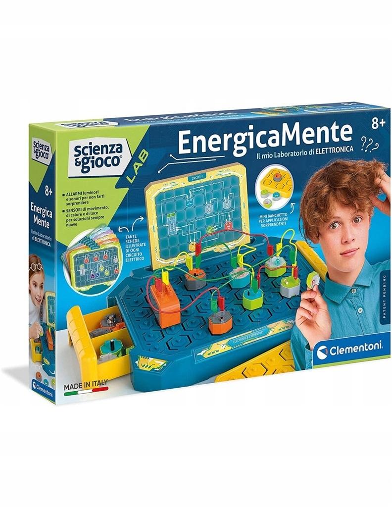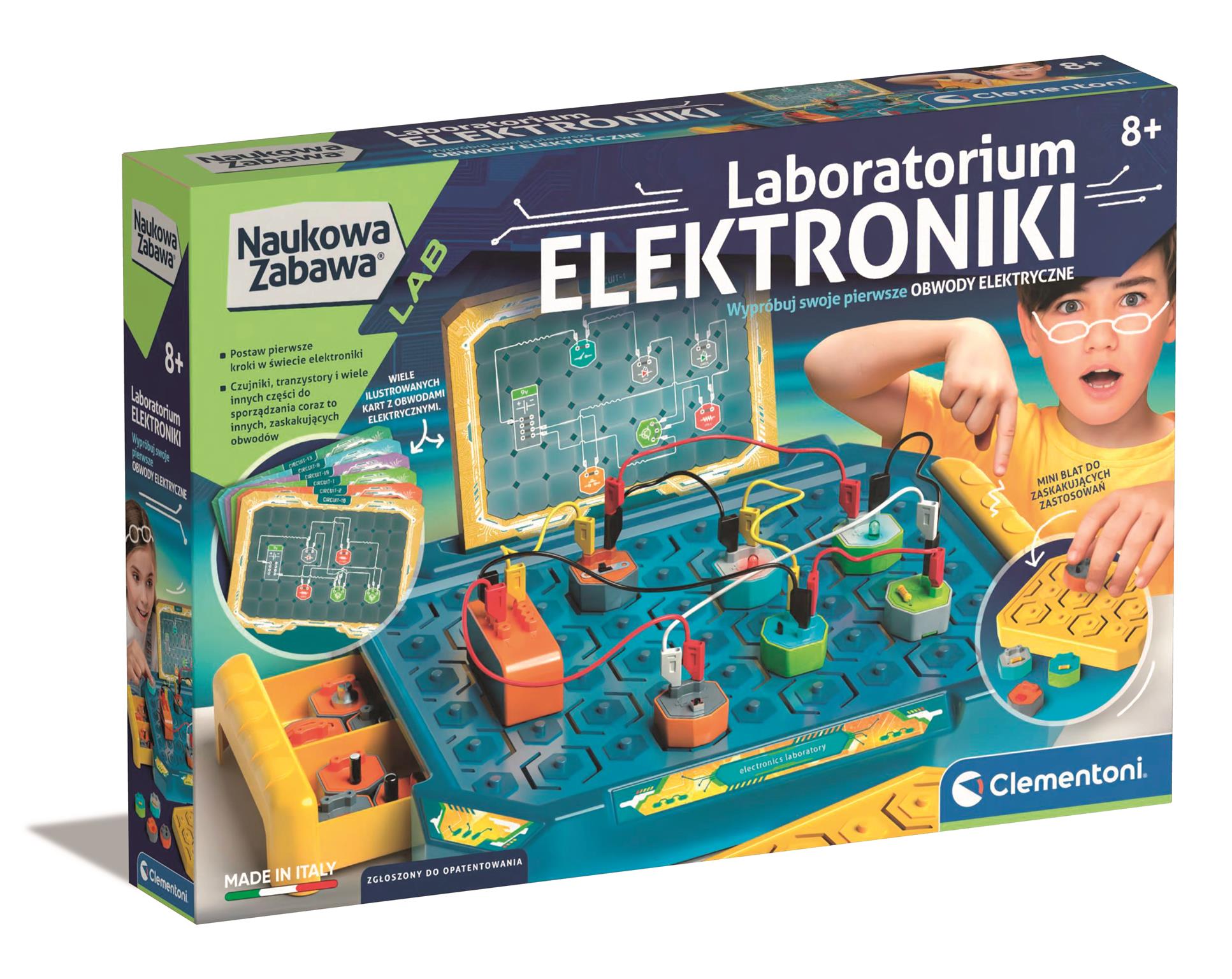 Komponenty z systemem montażowym opatentowane przez Clementoni! Czujnik jasności, brzęczyk, mikrofon i dioda LED do tworzenia obwodów roboczych. Ponad 20 obwodów o różnym stopniu trudności.