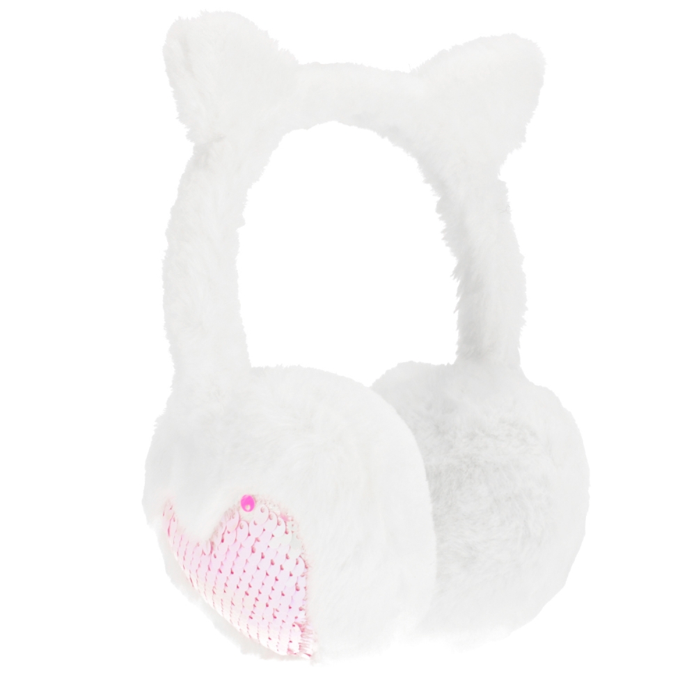 Zalety produktu nauszniki doskonale chronią uszy przed zimnem i wiatrem, świetnie sprawdzają się w okresie jesień - zima, uniwersalne i bardzo elastyczne, doskonale dopasowują się do kształtu głowy, pokryte miękkim i przyjemnym w dotyku futerkiem, ozdobione serduszkami ze zmieniających się cekinów, dodatkowo posiada ozdobne uszy, nauszniki w kolorze białym, posiadają regulację.