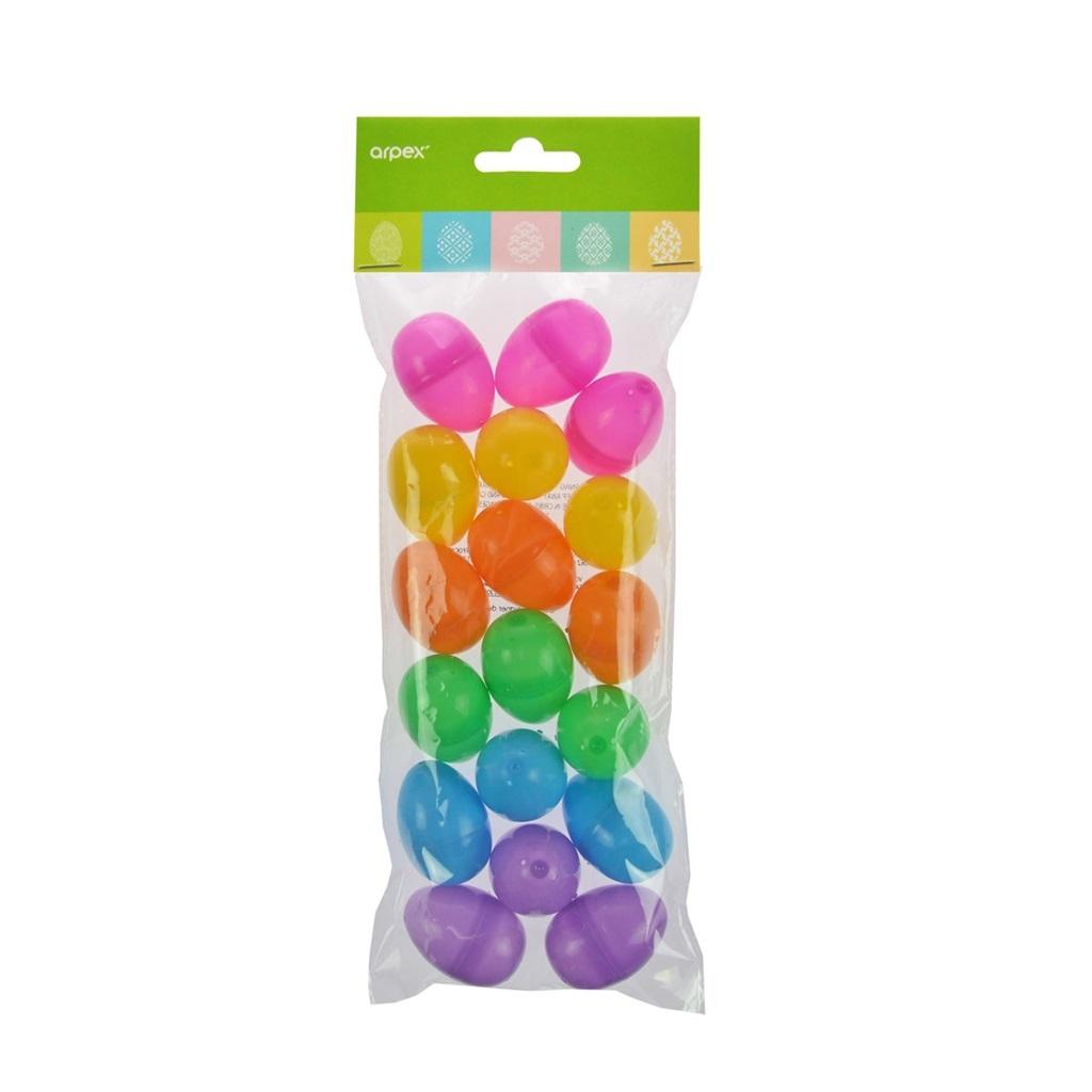 Małe, kolorowe, otwierane jajeczka ubarwią i udekorują każdy wielkanocny stół. Jajeczka otwierane z możliwością schowania niespodzianki w środku. Wysokość jajeczek: 4,5 cm. 18 szt. w opakowaniu.