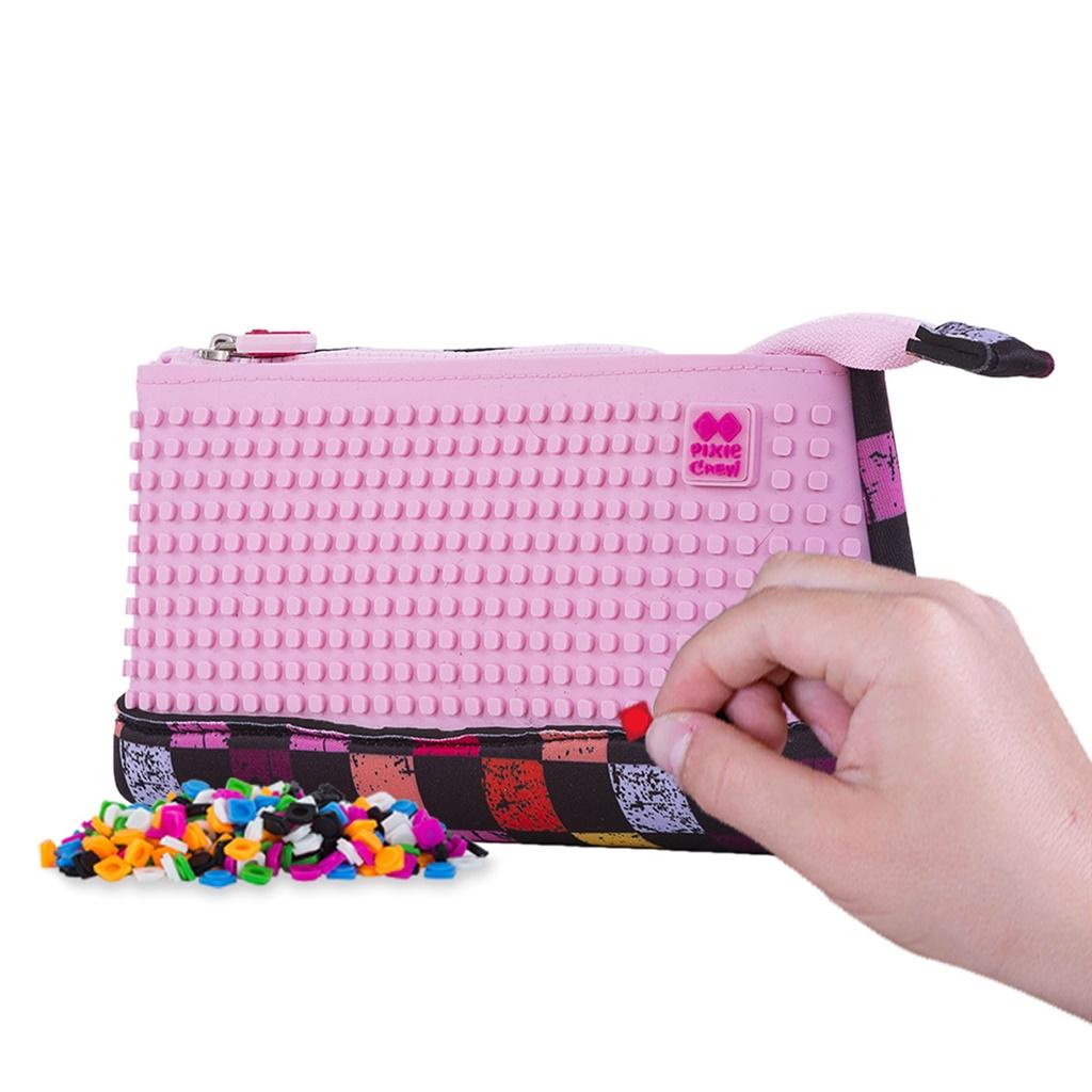 Duży, wielofunkcyjny piórnik na suwak PIXIE CREW z motywem kolorowej kostki. Posiada kreatywny różowy panel, na którym można tworzyć oryginalne i spersonalizowane grafiki, za pomocą małych silikonowych pikseli. Wykonany został z praktycznego, wytrzymałego neoprenu. Piórnik zapinany jest na suwak. Wewnątrz znajduje się wystarczająco dużo miejsca nie tylko na przybory szkolne, ale również na inne małe rzeczy, które chcemy mieć pod ręką. Dlatego doskonale sprawdzi się także jako kosmetyczka czy saszetka. Piórnik jest sprzedawany z dodatkowym darmowym zestawem około 100 pikseli.