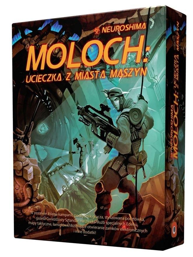 Moloch: Ucieczka z Miasta Maszyn to niepowtarzalne spojrzenie na świat Neuroshimy: bohaterowie rodem z krainy Molocha wędrują przez świat maszyn, odkrywają jego sekrety i dowiadują się równie wiele o stalowej bestii, co o sobie samych. Wszystko to w specjalnym, pudełkowym wydaniu pełnym materiałów, gadżetów i pomocy dla Mistrza Gry i Graczy.
