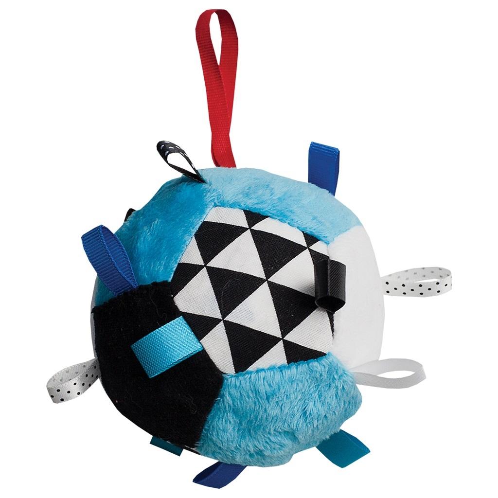 Mięciutka, materiałowa i kontrastowa piłka handmade od Mom's care  została stworzona z myślą o najmłodszych. To właśnie w pierwszym okresie  życia dziecka kluczową rolę odgrywa stymulacja zmysłów. Do uszycia  piłek używamy bezpiecznych tkanin o różnej strukturze. Dzięki temu  dziecko poznaje świat i stymuluje zmysł dotyku. Nie zapominamy także o  prawidłowym rozwoju zmysłu wzroku. Na samym początku nasze pociechy nie  dostrzegają kolorów i nie odróżniają kształtów. Skupiając wzrok na  kontrastowych geometrycznych wzorach niemowlę zwiększa efektywność  swojego mózgu. Niebieskie elementy wykonane są z najmilszej tkaniny  Minky. Dodatkowe metki sprawiają, że dziecko poprzez zabawę ćwiczy również małą motorykę. Wychodzimy też naprzeciw Waszym oczekiwaniom. W piłeczce znajduje się grzechotka, której delikatny dźwięk wzbudza zainteresowanie najmłodszych. Piłeczka motywuje do zabawy, potrząsania, prób rzucania i turlania. Miękkość piłeczki sprzyja jednocześnie nauce chwytania i przekładania z jednej rączki do drugiej. Dzięki przywieszce piłkę możesz powiesić obok  łóżka, może także podróżować z Twoim dzieckiem przypięta do fotelika  samochodowego, wózka lub torby.