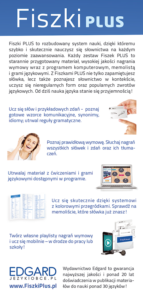 Niemiecki Fiszki PLUS dla średnio zaawansowanych 3 (B2) to pakiet będący częścią rozbudowanego systemu nauki, dzięki któremu szybko i skutecznie nauczysz się słownictwa na każdym poziomie zaawansowania. Każdy zestaw Fiszek PLUS to starannie przygotowany materiał, wysokiej jakości nagrania wymowy wraz z programem komputerowym, memolistą i grami językowymi. Z Fiszkami PLUS nie tylko zapamiętujesz słówka, lecz także poznajesz słownictwo w kontekście, uczysz się nieregularnych form oraz popularnych zwrotów językowych. Od dziś nauka języka stanie się przyjemnością! - Ucz się 1500 słów, wyrażeń i zdań – poznaj użycie gotowe wzorce komunikacyjne, utrwal reguły gramatyczne. - Poznaj prawidłowa wymowę. Słuchaj nagrań wszystkich słówek i zdań oraz ich tłumaczeń - Utrwalaj materiał z ćwiczeniami i grami językowymi dostępnymi w programie (do pobrania) - Ucz się skutecznie dzięki systemowi kolorowych przegródek. Sprawdź na memoliście, które słówka już znasz! - Twórz własne playlisty nagrań wymowy i ucz się mobilnie – w drodze do pracy lub szkoły! Fiszki PLUS to rozbudowana seria fiszek, ułożona w wygodny system, dzięki któremu sam decydujesz, od którego poziomu zacząć naukę. W ramach serii dostępne są wszystkie trzy poziomy zaawansowania – początkujący, średnio zaawansowany i zaawansowany. Aby ułatwić wybór fiszek, każdy z trzech poziomów (podstawowy, średnio zaawansowany i zaawansowany) podzielono na trzy kolejne zestawy: 1, 2, 3 tak byś jak najlepiej dobrał najlepsze dla siebie fiszki i z łatwością mógł zdecydować o wyborze kolejnego zestawu. W serii również: Niemiecki. Fiszki Plus dla początkujących 1 Niemiecki. Fiszki Plus dla początkujących 2 Niemiecki. Fiszki Plus dla początkujących 3 Niemiecki. Fiszki Plus dla średnio zaawansowanych 1 Niemiecki. Fiszki Plus dla średnio zaawansowanych 2