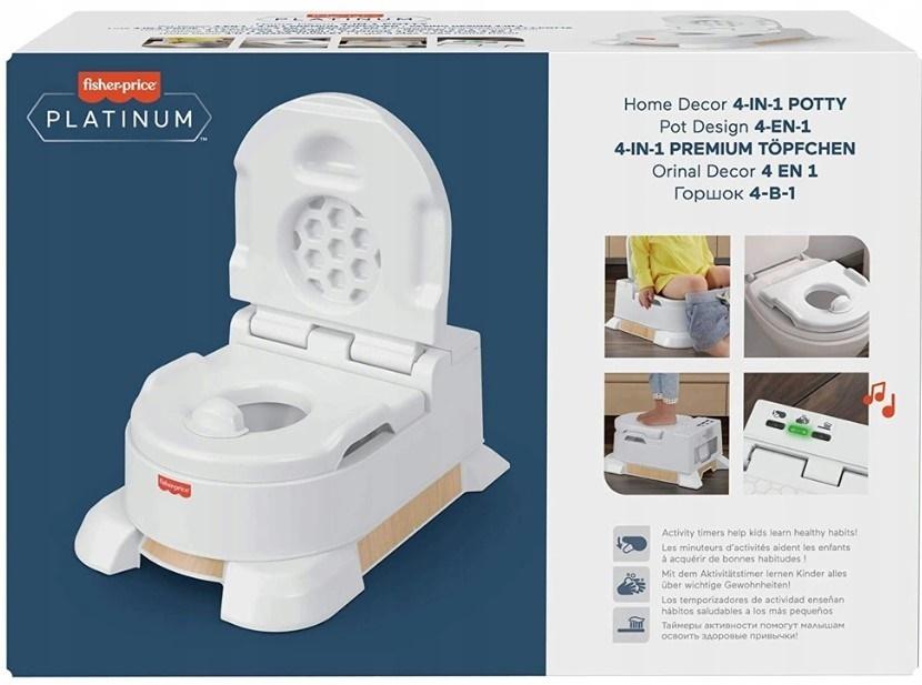 Fisher-Price(R) Nocnik 4 w 1 wygląda jak miniaturowa wersja prawdziwej toalety. Jasna i nowoczesna stylistyka sprawi, że wpasuje się do każdego wnętrza. Nocniczek pomaga dziecku w treningu czystości, wygodne uchwyty zapewniają poczucie bezpieczeństwa, a zdejmowany zbiorniczek ułatwia czyszczenie. Gdy maluch zacznie się już uczyć, jak korzystać z prawdziwej toalety, zdejmowana nakładka nocnika zapewni mu podparcie. Nocniczek zamienia się też w podnóżek, dzięki któremu dziecko bez problemu dosięgnie do umywalki. Świecący przycisk z tyłu aktywuje realistyczne odgłosy spłukiwania toalety, a dwa aktywizujące timery zachęcają dzieci do zdrowych nawyków, takich jak szczotkowanie zębów i mycie rąk.