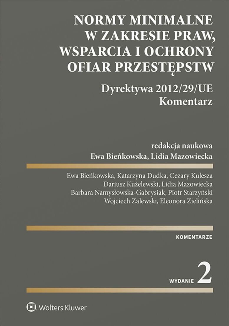 Państwa członkowskie, w tym Polska, od 16 listopada 2015 r. są zobowiązane do stosowania przepisów dyrektywy Parlamentu Europejskiego i Rady 2012/29/UE ustanawiającej normy minimalne w zakresie praw, wsparcia i ochrony ofiar przestępstw. Mimo to polskie regulacje prawne nie spełniają jej wszystkich wymogów. Komentarz do przepisów tego aktu jest wskazówką, jak je zmienić, aby tę zgodność osiągnąć. Unormowanie uprawnień i umożliwienie ofiarom przestępstw korzystania z nich w praktyce - co wielokrotnie podkreślano w dyrektywie - służy łagodzeniu bezpośrednich skutków przestępstwa, a przede wszystkim przeciwdziałaniu dalszym, pośrednim jego następstwom, które są efektem niewłaściwego traktowania ofiar i lekceważenia ich potrzeb (wiktymizacja wtórna), oraz zapobieganiu aktom zastraszania i zemsty ze strony sprawców i ich otoczenia społecznego, mających często postać zachowań przestępczych. Drugie wydanie publikacji uwzględnia zmiany wprowadzone np: ustawami: z 28 lipca 2023 r. o zmianie ustawy - Kodeks rodzinny i opiekuńczy oraz niektórych innych ustaw, która określa szczególne środki ochrony przeciwdziałające zagrożeniom przestępczością na tle seksualnym i szczególne środki ochrony małoletnich; z 13 stycznia 2023 r. o zmianie ustawy - Kodeks postępowania cywilnego oraz niektórych innych ustaw wprowadzającą zapisy mające chronić przed wtórną wiktymizacją pokrzywdzonych i zapobiegać jej. Publikacja będzie przydatna dla prawników praktyków (adwokatów, sędziów, prokuratorów), funkcjonariuszy Policji, kuratorów, pracowników administracji samorządowej, organizacji pozarządowych oraz przedstawicieli nauki zajmujących się sprawami ofiar przestępstw.