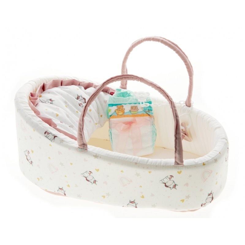 Białe nosidełko w jednorożce 92107 to oryginalny projekt znanej marki Antonio Juan. Dodatek przeznaczony jest dla lalek o maksymalnej wysokości 42 cm. Urocze akcesorium dziecko może wykorzystać na wiele sposobów: przenosić w nim lalę, traktować jako łóżeczko, a nawet zastąpić kołyskę. Aby posłanie było wygodne, producent dołożył małą poduszeczkę, która jest miękka i została wykonana z wysokiej jakości materiałów. Poduszka posiada ten sam wzór co nosidełko, a dodatkowo zdobi ją przyszyta falbanka w kolorze pudrowego różu. Akcesorium dla lalki posiada dwie raczki i wykonane zostało ze sztywnej gąbki, staranie obszyte miękkim materiałem.