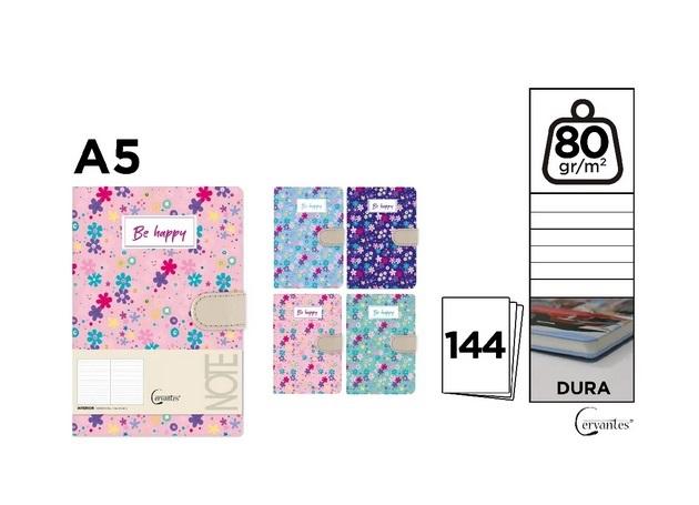 Związany notatnik. Tekturowa okładka podszyta zabawnymiwzorami. Zapięcie na zatrzask. 144 arkusze80 g/m2 z poziomymi liniami. Rozmiar A5. Wymiary:190 x 134 mm. Być szczęśliwym projektem kwiatowym.4 różne kolory: różowy, wodny zielony, jasnoniebieskii niebieski.