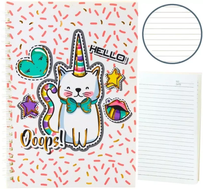 NOTATNIK / ZESZYT W LINIE KOT JEDNOROŻEC NA BIAŁYM TLE Z RÓŻOWYMI KRESKAMI 60 KARTEK A5 Notatnik z motywem kota jednorożca to doskonała propozycja dla dzieci i młodzieży, które kochają wesołe, bajkowe wzory. Okładka utrzymana w jasnej kolorystyce przyciąga uwagę detalami - białe tło pokryte różowymi kreskami stanowi tło dla sympatycznego kotka z tęczowym rogiem i ogonem, ubranego w turkusową kokardkę. Całość dopełniają ozdobne ilustracje serca, gwiazdek i napisów, które dodają zeszytowi jeszcze więcej uroku. Wewnątrz znajduje się 60 kartek w linie, które świetnie sprawdzą się zarówno w szkole, jak i do domowych zapisków czy dziecięcego pamiętnika. Spiralne bindowanie ułatwia korzystanie z każdej strony, umożliwiając wygodne otwieranie zeszytu na płasko. Kompaktowy format A5 pozwala zabrać go wszędzie - zmieści się w plecaku, torbie czy szufladzie. To świetne połączenie funkcjonalności i kolorowego, dziecięcego stylu - idealne na prezent lub do codziennego użytku. SPECYFIKACJA: Wzór okładki: Kot jednorożec Rodzaj okładki: Kartonowa, lakierowana Elementy dekoracyjne: Ilustracje tęczy, serca, gwiazdek, napisy Rodzaj kartek: W linie Ilość kartek: 60 Kolor kartek: Biały z nagłówkiem Format: A5 Wymiary: 21 x 15 x 1 cm ZAWARTOŚĆ ZESTAWU: Notatnik w linie - 60 kartek