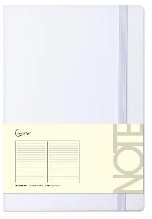 Notatnik kołowy. Okładka z tektury w linie. Zapięciena gumkę w kolorze pokrowca. 96 arkuszy o gramaturze 80 g/m2. Różne wzory: linie poziome, kwadraty 4 x 4 mm i gładkie. Rozmiar A5. Wymiary: 210x 148 mm. Biały kolor.