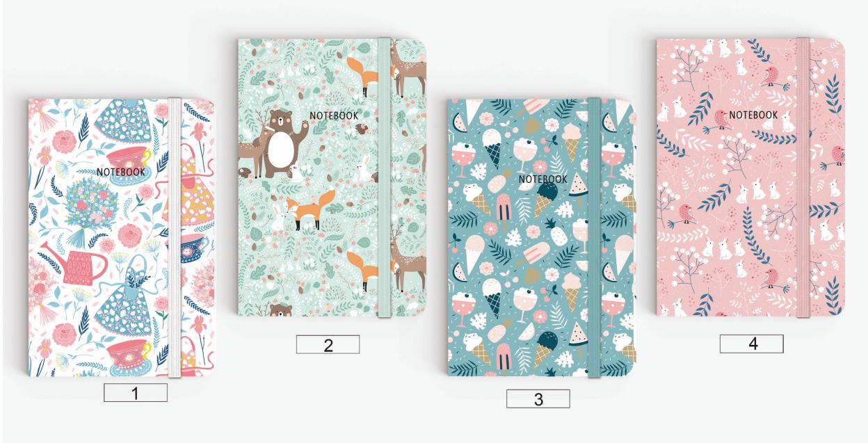 Notatnik 96 kartkowy z gumką w twardej okładce. Format A6. Wymiar 14.5x10.5 cm.