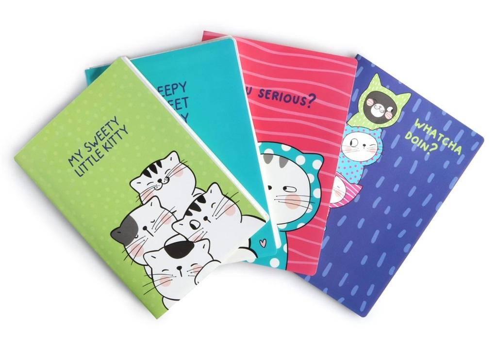 Papier kremowy, 70 kartek w kratkę. Szyty, okładka PP. Mix czterech wzorów okładek. Gramatura 70 g. Format B5.