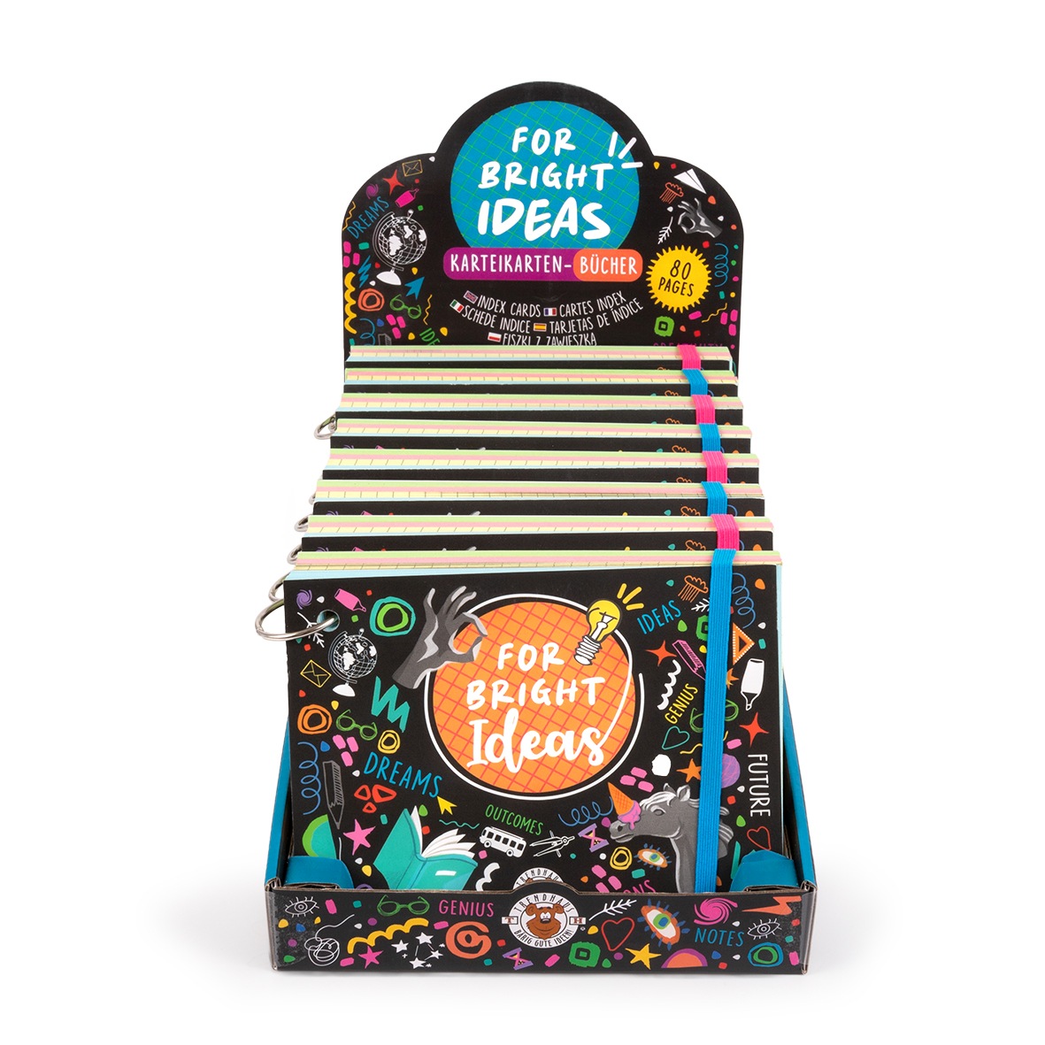 Poszczególne karty indeksu w 4 różnych kolorach i liniach (kratka, w linie, kropkowane, puste) można łatwo wyjąć za pomocą metalowego pierścienia i są idealne do zabrania do szkoły, na uniwersytet lub do biura.