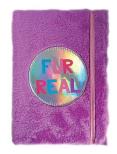Notatnik ma króciutkie, fioletowe futerko. Na środku okładki znajduje się mieniący metalicznie okrąg z napisem „FUR REAL”. Wygodna gumka zabezpiecza notatnik przed przypadkowym otwarciem. Notatnik A5, 80 kartek, w linie.