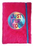 Notatnik ma króciutkie, różowe futerko. Na środku okładki znajduje się mieniący metalicznie okrąg z napisem „JUST FUR YOU”. Wygodna gumka zabezpiecza notatnik przed przypadkowym otwarciem. Notatnik A5, 80 kartek, w linie.