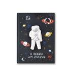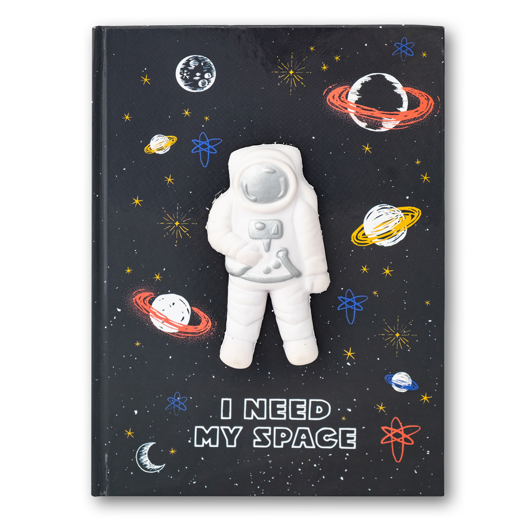 Notatnik A5 w twardej oprawie. Notatnik w czarnym kolorze na froncie posiada grafiki w tematyce kosmosu. Na środku okładki znajduje się mięciutki gniotek w kształcie kosmonauty. 80 kartek w kratkę.