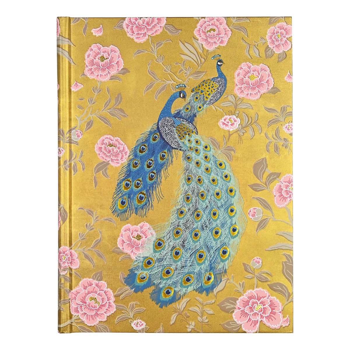 Okładka z motywem królewskich pawi, umieszczonych na złotym tle. Notatnik posiada okładkę zdobioną złotą folią i tłoczeniami oraz złocone brzegi stron.