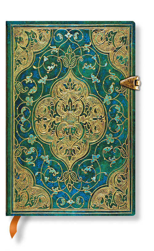 Notatnik Turquoise Chronicles Midi Lined. Niezwykłej marki Paperblanks. Pięknie zdobiona wytłaczana okładka o niesamowitej fakturze. Wewnątrz na tylnej okładce koperta na drobne notatki.Satynowa wstążka jako zakładka. Papier ekologiczny. Notatnik szyty.