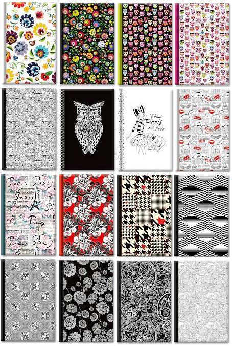 Notesy książkowe z blokiem notatnikowym na papierze ecru, w delikatne szare linie oraz czerwoną wstążką. Dostępne w trzech różnych formatach. Kolorowe okładki graficzne, powleczone specjalną aksamitną folią. Możliwość wklejek reklamowych. Uwaga !!!  Wzór wysyłany losowo !