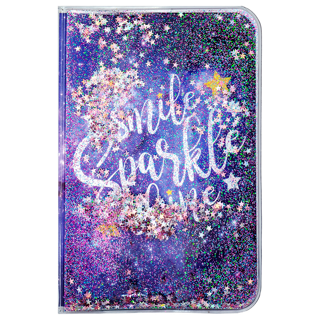 Notatnik z nadrukiem "Smile Sparkle Shine"! Okładka wypełniona jest wodą z gwiazdkami i brokatem.