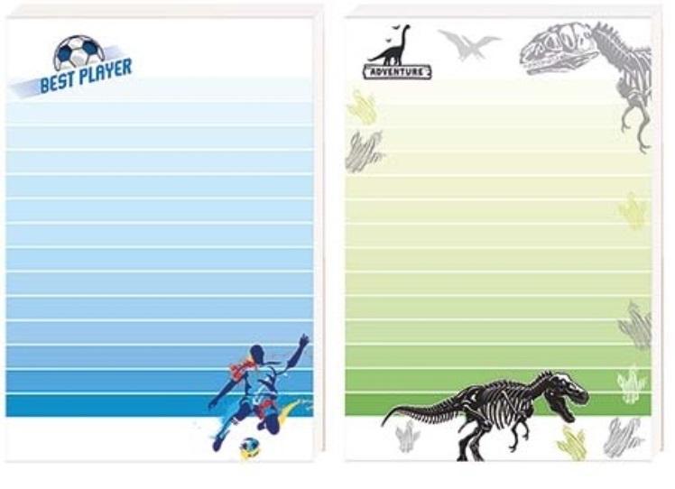 Notes A6 posiada 80 kartek z kolorowym poddrukiem. Grzbiet klejony po krótszym boku. Charakteryzuje się estetycznym wykończeniem i modną okładką idealną dla chłopców