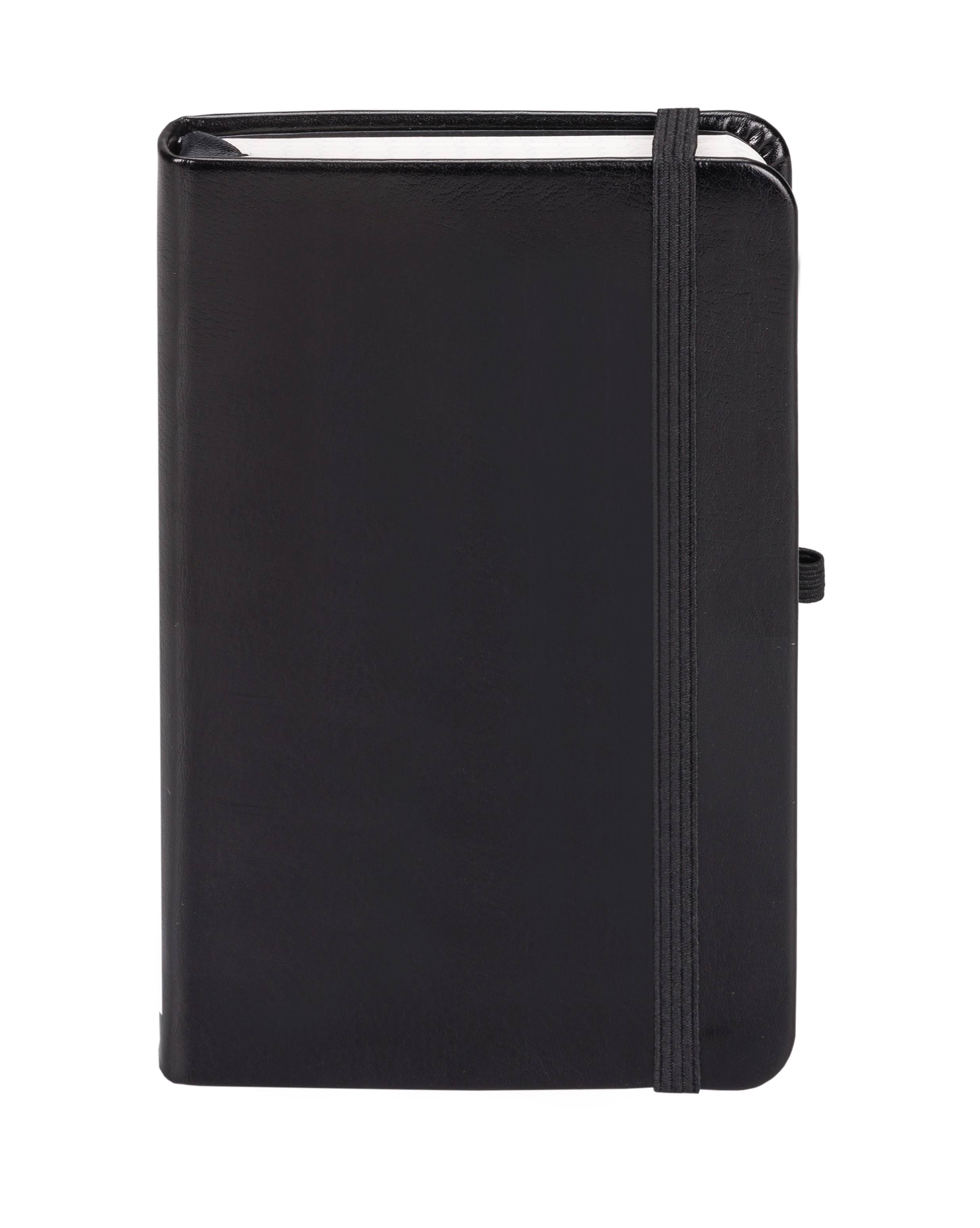 Oprawa twarda, skóra ekologiczna. Papier 80 g. Wyklejka notesu oraz kieszeń na ważne, luźne notatki wykonana z ozdobnego papieru w kolorze czarnym. Wstążka, gumka zamykająca i szlufka na długopis w kolorze okładki. Ilość stron: 192 Wymary: 90 x 140 mm