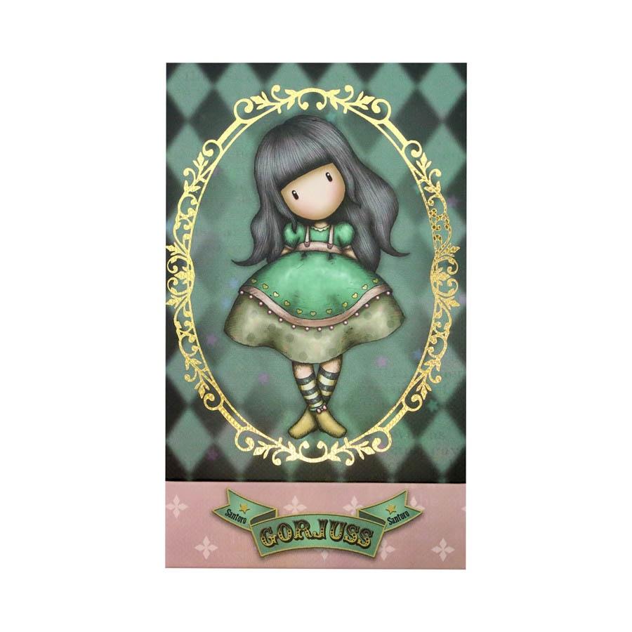 Ozdobiony eleganckim złoceniem i wizerunkiem dziewczynki Gorjuss.
