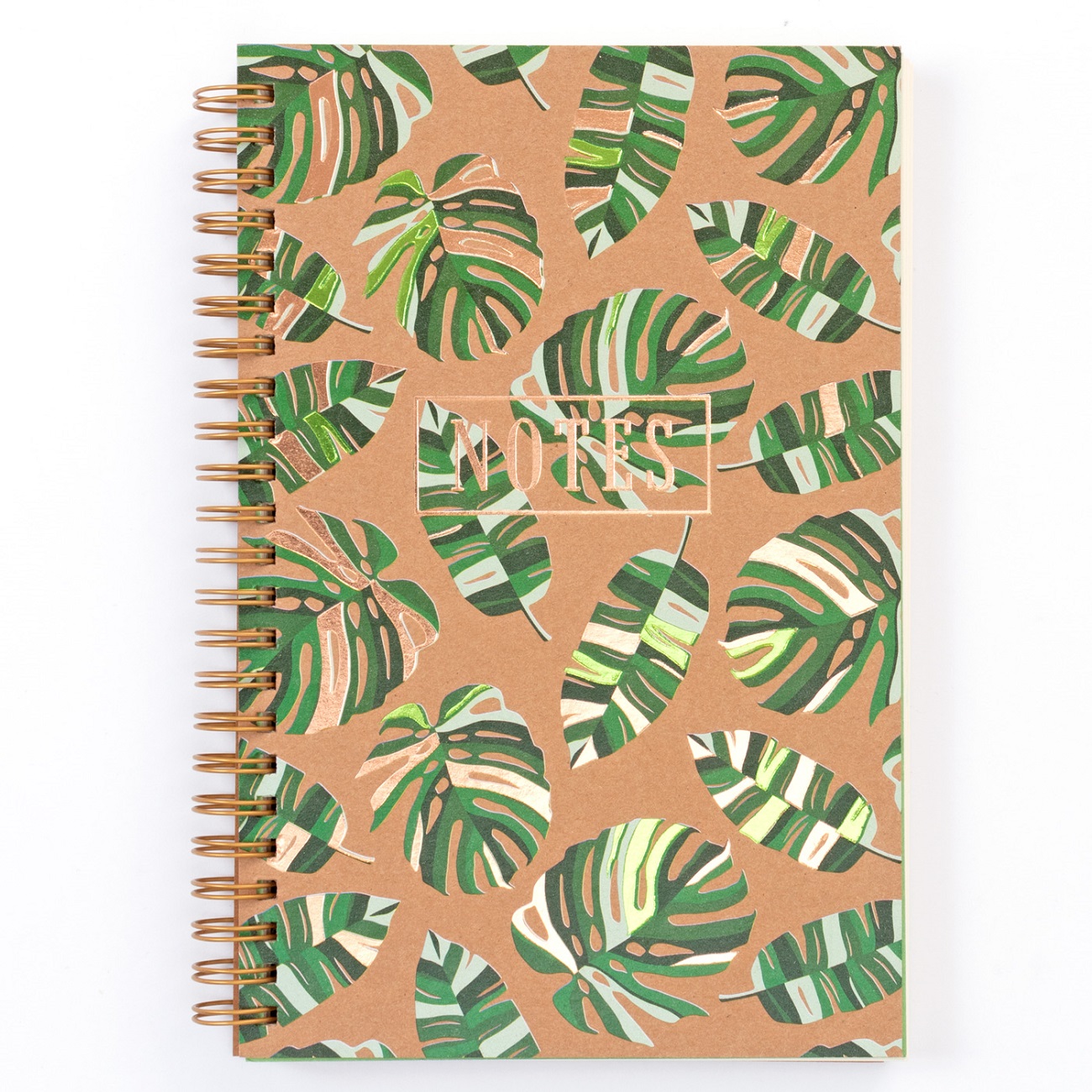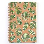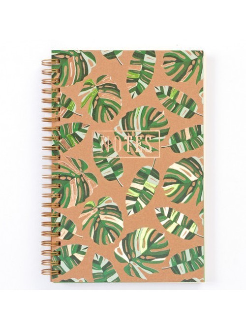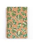 Ekskluzywny notes ekologiczny z grafiką z liśćmi monstery dziurawej. 192-stronicowy kołonotatnik łączy w sobie okładkę z tektury z recyklingu 650g z papierem kremowym o gramaturze 70g.