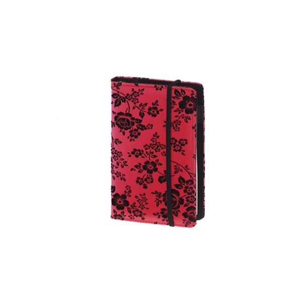 Notes książkowy z kolekcji Lima, z wymiennym wkładem, idealny na krótkie notatki, rozmiar do torebki. Czerwona okładka z czarnymi, zamszowymi motywami kwiatowymi. Wnętrze okładki wykończone czarnym zamszem. Wkład notesu 100 stronicowy, kartki w kratkę, w linie, lub czyste, kartki szyte i klejone, sztywna okładka, wstążka ułatwiająca korzystanie z notesu.Wymiar: 8,5x14,5 cm.