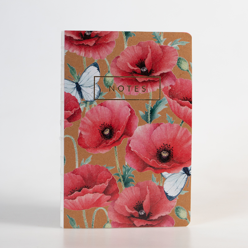 Okładka notesu z grafiką w intensywnie czerwone maki i tłoczony na złoto napis tworzą piękne zestawienie z naturalną tekturą.