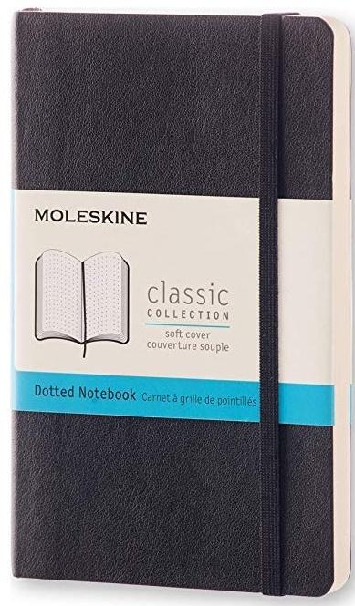 Notes marki Moleskine Classic w rozmiarze Pocket (9x14cm) w kropki. Zamykany na gumkę. Okładka miękka w kolorze czarnym.