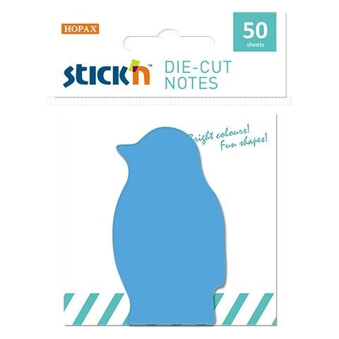 Notes samoprzylepny o wymiarach około 70x70 mm. Zawiera 50 kartek w kolorze niebieskim motyw pingwin.