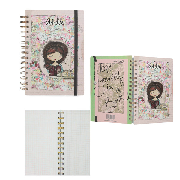 Notatnik spiralny A5 marki Anekke z bajkowej kolekcji Jane. Na kartonowej, twardej okładce znajduje się pełonkolorowa grafika z kolekcji Anekke. Na okładce z przodu widzimy rozmarzoną Jane czytająca książkę. Napis z tyłu zaprasza do zagubienia się wczytaniu :) - Lose yourself in a book. Okładki wewnętrzne również zachwycają kolorami. Notes zawiera w sobie 120 kartek w kratkę, są podzielone na kolorowe sekcje. Kratka w każdej z sekcji jest również kolorowa. Całość jest złączona trwałą spiralą w kolorze złota. Dodatkowo notes posiada dołączoną gumkę, która skutecznie zamyka notatnik.
