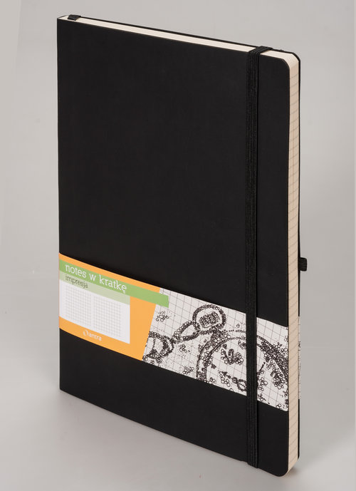 5. Pierwsza i ostatni strona notesu wykończona ozdobnym papierem w kolorze czarnym