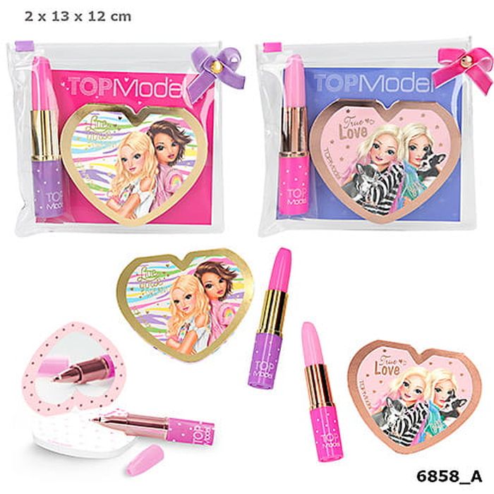 Notesik z lusterkiem i długopisem Top Model, zestaw notesik z lusterkiem i długopis w kształcie szminki Top Model, pakowany w plastikowe etui.