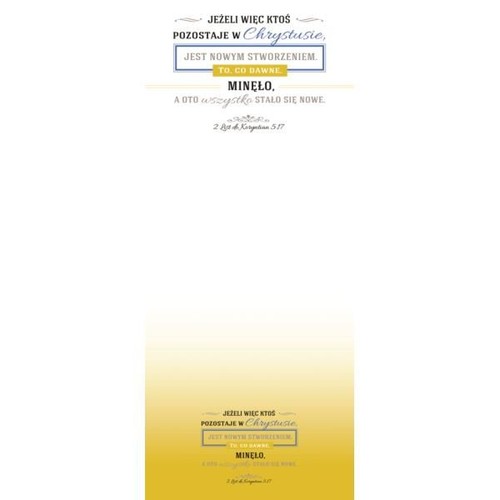Notes z magnesem, doskonały na lodówkę. Notes pomoże z pewnością w tworzeniu listy zakupów jak i zapisywaniu ważnych informacji. Wszystko to z wersetem Biblijnym w tle. Tekst z 2 List do Koryntian 5,17 Jeżeli więc ktoś [pozostaje] w Chrystusie, jest nowym stworzeniem. To, co dawne, minęło, a oto wszystko stało się nowe.