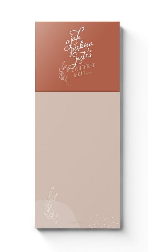 Minimalistyczny, kobiecy i pełen ciepła notes z magnesem O jak piękna jesteś, Przyjaciółko moja (Pnp 1,15) to praktyczny notatnik magnetyczny z inspirującym cytatem z Biblii. Subtelne połączenie ciepłego, terakotowego odcienia z jasnym beżem oraz delikatną roślinną grafiką tworzy nowoczesny, estetyczny design, który pięknie prezentuje się w kuchni, biurze czy domowym gabinecie.