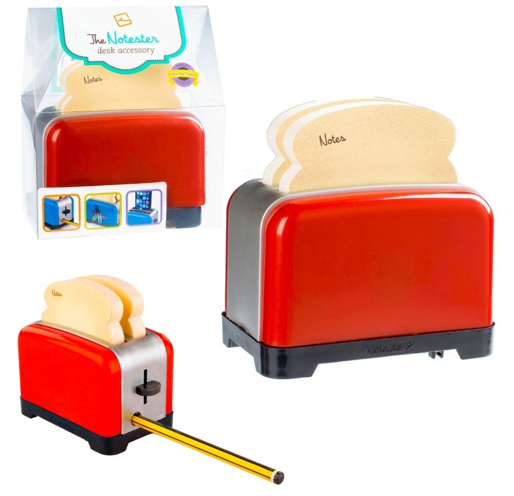 Zabawny toster, który zawiera 2 notesy (po 100 kartek) z karteczkami samoprzylepnymi w kształcie tostów (sticky notes). Bok Notestera posiada magnes, dzięki któremu uporządkujesz np. spinacze. Posiada wbudowaną temperówkę. Może być używany jako stacja dokująca do ładowania telefonu. Pasują do niego standardowe karteczki samoprzylepne.
