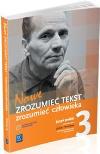 Podręcznik Nowe Zrozumieć tekst - zrozumieć człowieka dla klasy 3 został przygotowany z myślą o kształceniu ogólnym w zakresie podstawowym i rozszerzonym w liceum i technikum. Materiał jest ułożony chronologicznie i podzielony na epoki historycznoliterackie. W ramach epok zastosowano podział na jednostki lekcyjne. Treści z nauki o języku są zintegrowane z materiałem literacko-kulturowym. Duży nacisk położono na interdyscyplinarność - przy okazji mówienia o literaturze omawiane są też inne teksty kultury (malarstwo, rzeźba, film, teatr).Każdy dział rozpoczyna lekcja wprowadzająca w daną epokę literacką, a kończy lekcja powtórzeniowa. Wykład główny przeplatają lekcje z tekstami publicystycznymi lub popularnonaukowymi do ćwiczenia umiejętności wykonywania różnych działań na tekście nieliterackim. Są one poświęcone zagadnieniom związanym z daną epoką literacką. Polecenia do tekstów zostały tak skonstruowane, by rozwijać umiejętności tworzenia wypowiedzi ustnych i pisemnych.Całość wzbogacają bloki pozwalające zebrać i usystematyzować wiedzę (przewodniki po autorach, lekturach, zjawiskach literackich i kulturowych, treściach z nauki o języku), a także działy ,,Umiem więcej"" zawierające praktyczne wskazówki dotyczące tworzenia poszczególnych form wypowiedzi (interpretacja, rozprawka, wypowiedź ustna itp.) oraz przykładowe zadania wraz z realizacjami.