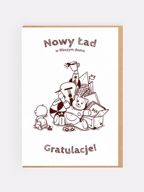 Idzie zmiana, ale czy to będzie dobra zmiana? Już wkrótce nastanie NOWY ŁAD w Twoim domu! Jakie będą tego konsekwencje? Kartka okolicznościowa NOWY ŁAD poleca się z okazji narodzin dziecka jako dodatek do prezentu dla młodych rodziców. Kartka w zestawie z elegancką kopertą jest pusta w środku i została wydrukowana na papierze ekologicznym. Jej wnętrze czeka na wypełnienie treścią płynącą prosto z Twojego serca! Uniwersalna kartka okolicznościowa z gratulacjami z okazji narodzin dziecka Wymiary kartki (po złożeniu): 12 cm x 17 cm Gramatura papieru: 250 g/m2 W zestawie elegancka koperta z eko kraftu Wymiary koperty: 12,5 cm x 17,5 cm Gramatura koperty: 100 g/m2 Zestaw zapakowany w folię Idealna jako dodatek do prezentu z okazji baby shower Wyprodukowano w Polsce