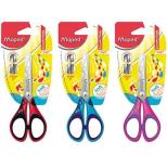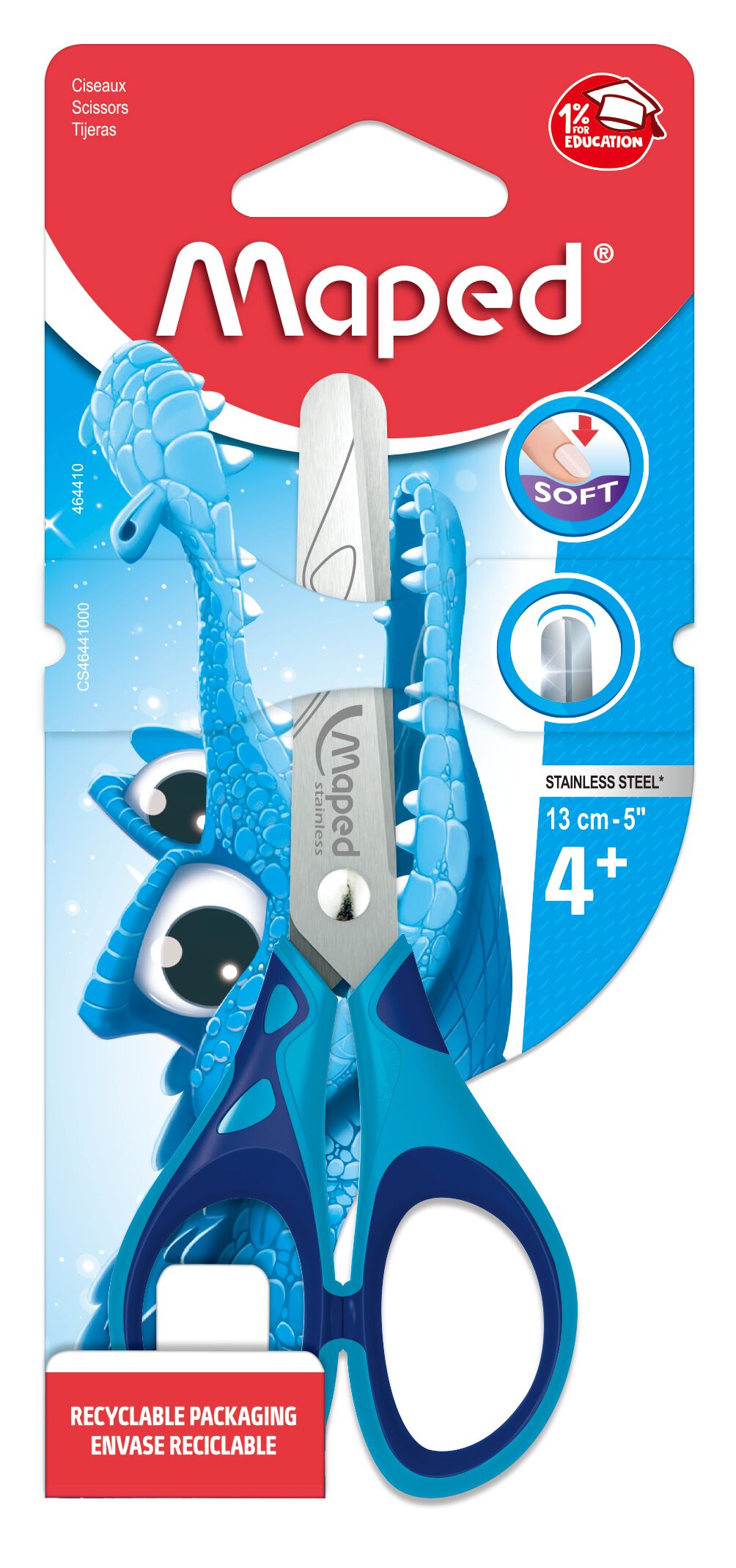 Nożyczki szkolne wykonane ze stali nierdzewnej. Grawerowane ostrza z zaokrąglonymi końcami - O 10 mm. Plastikowe uchwyty, miękkie w środku, profilem dostosowane do dziecięcej dłoni. Długość 13 cm. Miks 3 kolorów; niebiesko-granatowe, czerwono-czarne i różowo-fioletowe. Blister 1 szt.