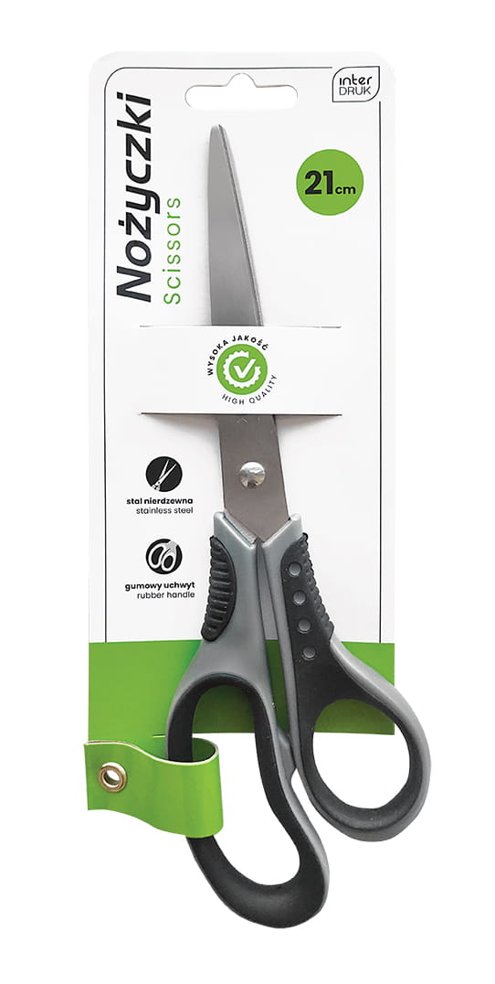 Poręczne nożyczki o długości 21 cm. Precyzyjne ostrze wykonane ze stali nierdzewnej. Gumowy uchwyt o ergonomicznym kształcie zapewnia komfort użytkowania.