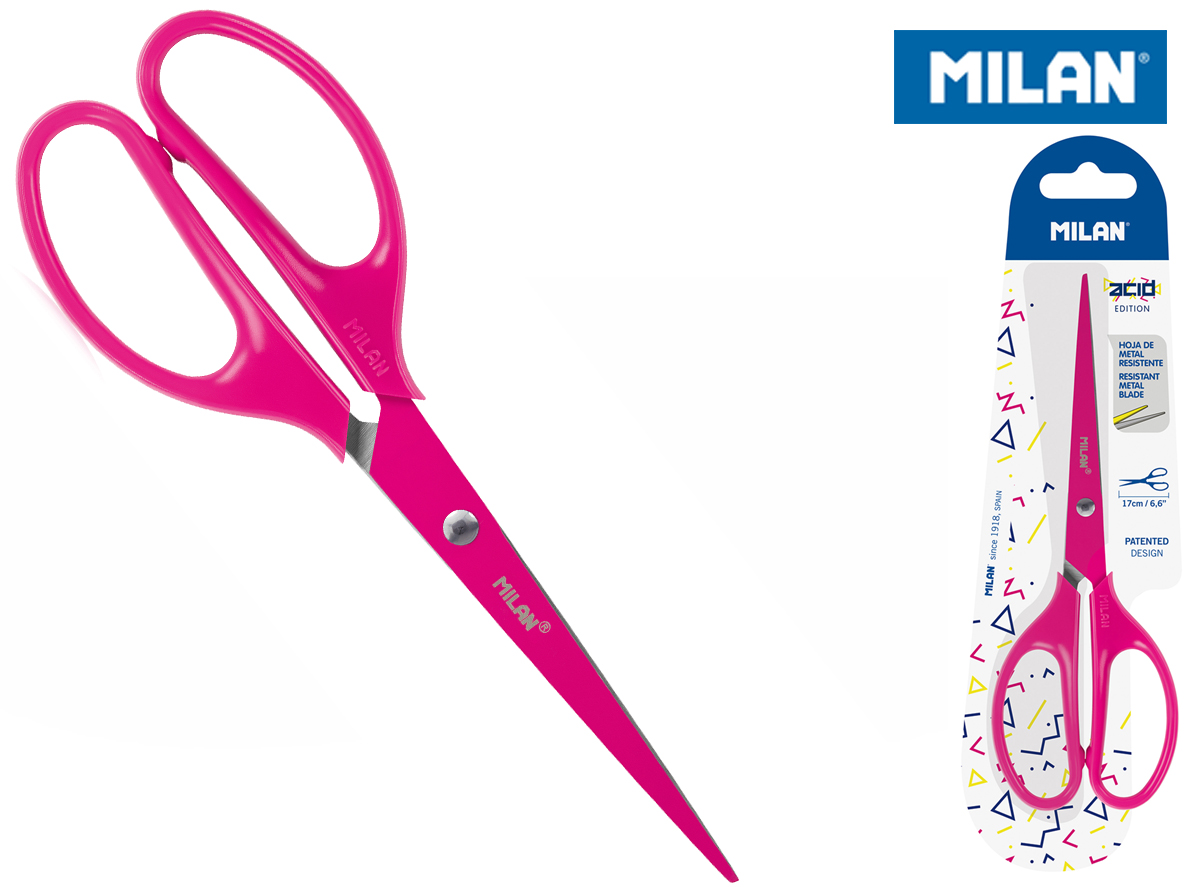 Nożyczki biurowe z serii ACID idealne do precyzyjnego wycinania, nawet drobnych elementów. Lakierowane ostrza z nierdzewnej stali. Długość 17 cm. Pakowane na blistrze, różowe.
