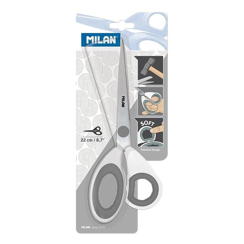 Nożyczki biurowe z ostrzem ze stali nierdzewnej. Biały plastikowy uchwyt z szarymi elementami, odporny na wstrząsy, ergonomiczny uchwyt. Długość nożyczek 22 cm Długość ostrza 13 cm