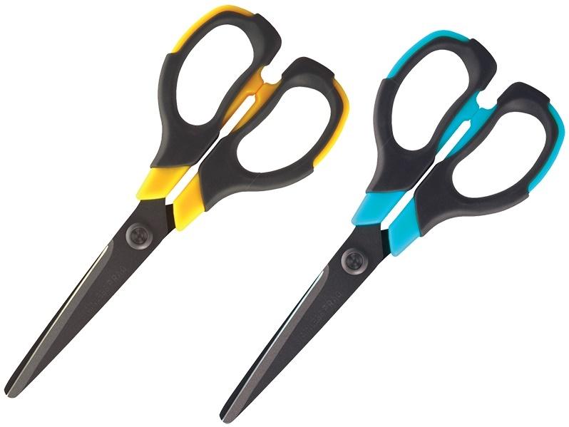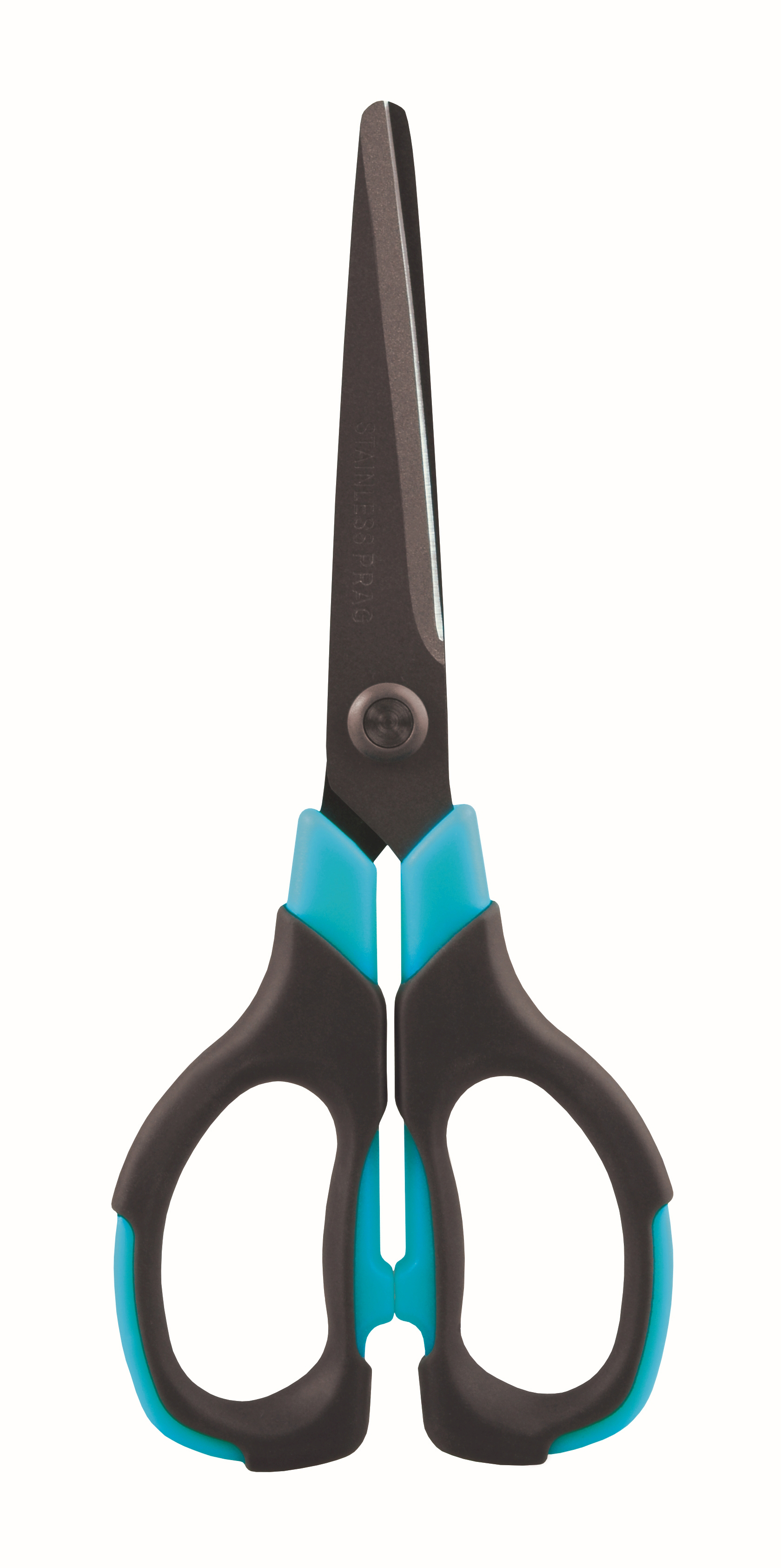 Nożyczki wykonane ze stali nierdzewnej. Ostrze pokryte fluorem odporne na przywieranie kleju oraz taśmy klejącej. Idealnie wyprofilowany, miękki uchwyt sprawia, że nożyczki mogą być używane zarówno przez osoby praworęczne, jak i leworęczne. Kolor niebieski. Rozmiar 6 3/4".